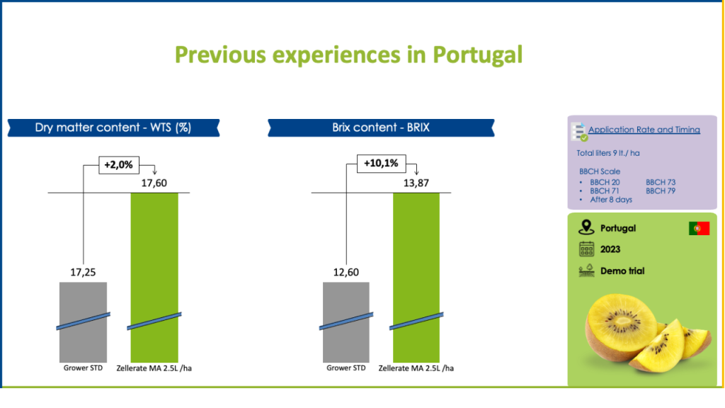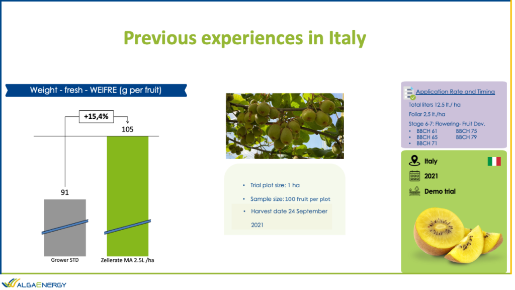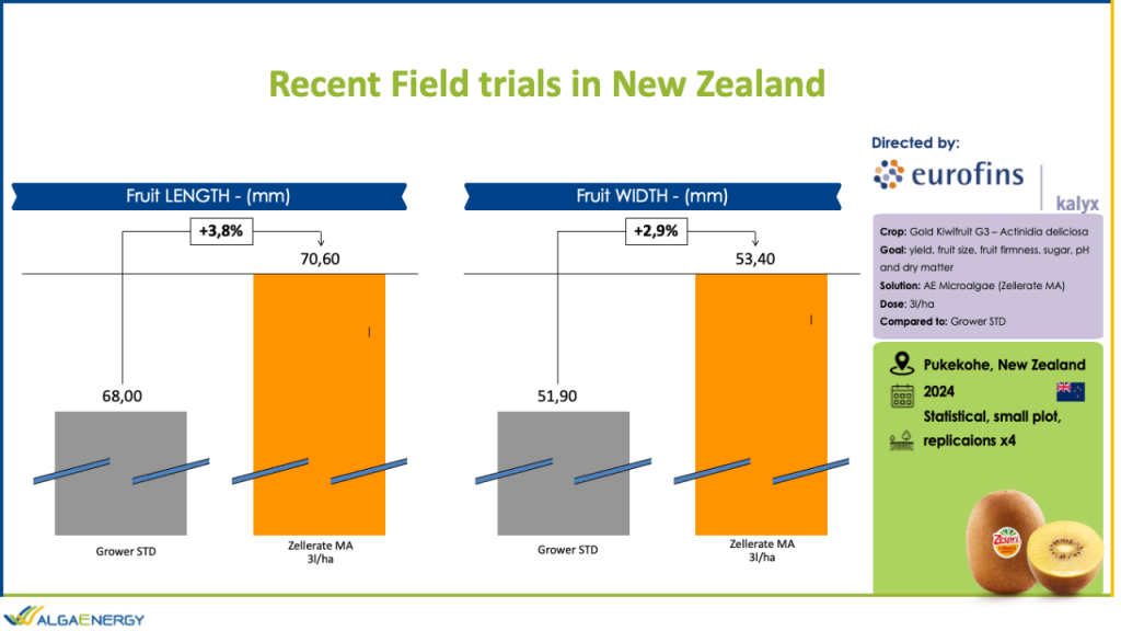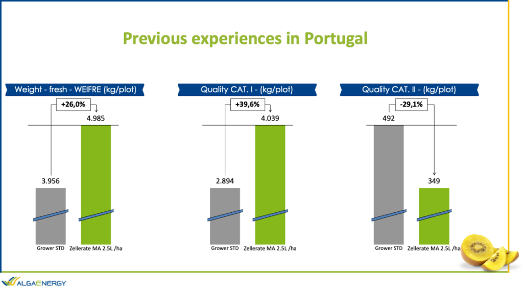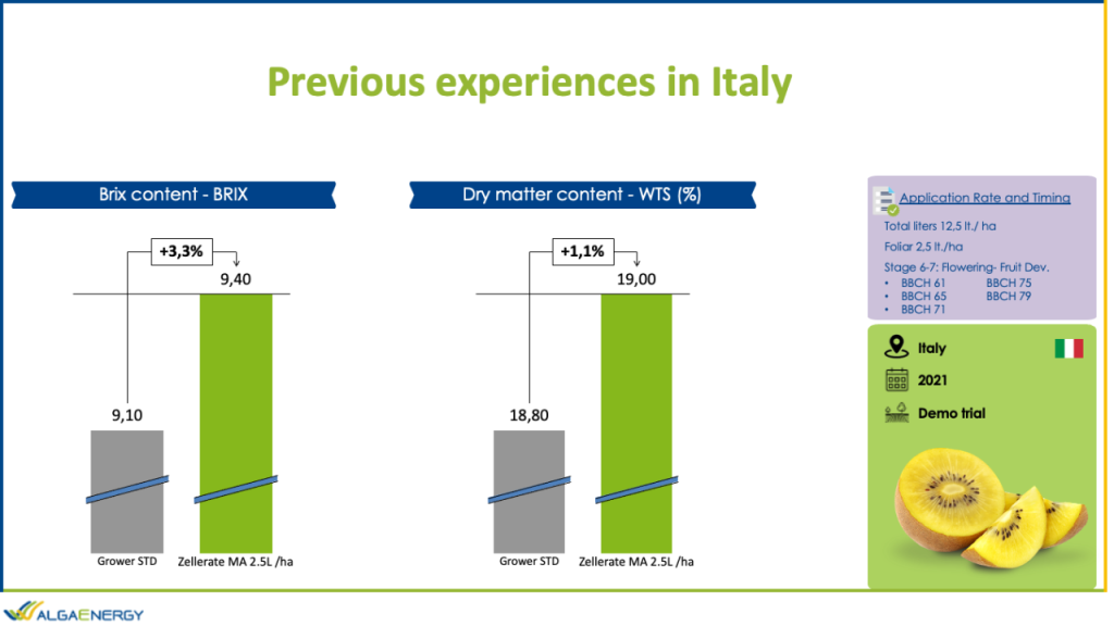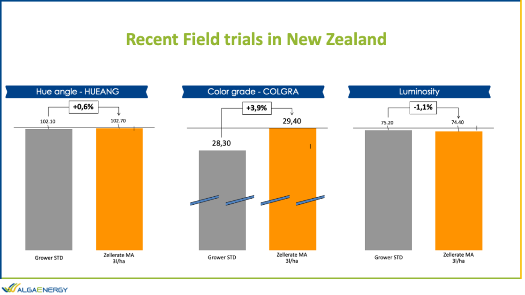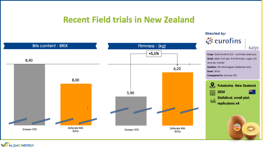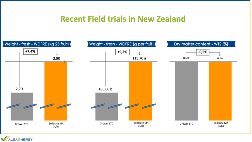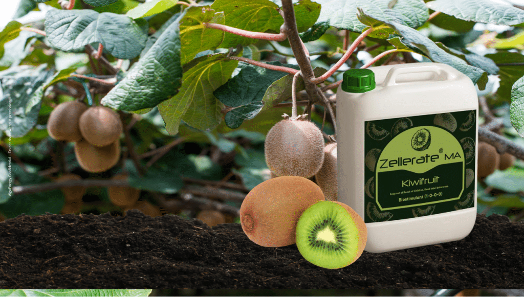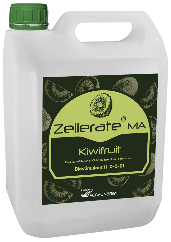 Zellerate MA, manufactured by AlgaEnergy in Spain, has been proven in many countries, through independent, replicated and farmer demonstration trials, to offer many benefits to Kiwifruit growers.